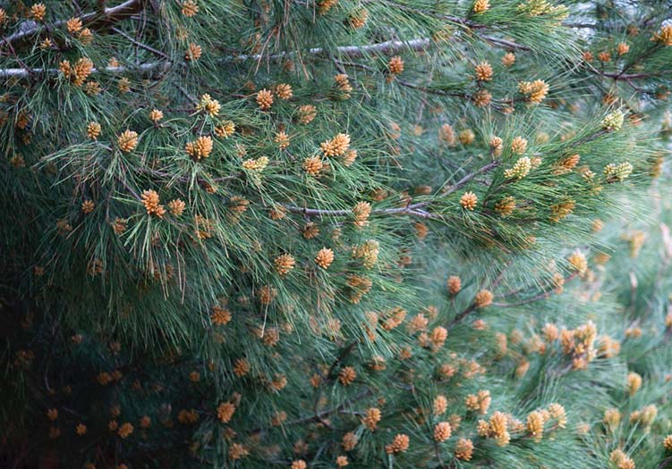 Die Kiefer ist ein einhäusiger Nadelbaum. Sie blüht nach 10 bis 15 Jahren zum ersten Mal und bildet sowohl männliche als auch weibliche Blüten. Die männlichen Blüten sind an den gelben, hängenden Blütenständen zu erkennen. Die weiblichen Blüten schimmern rötlich und haben eine runde Form.