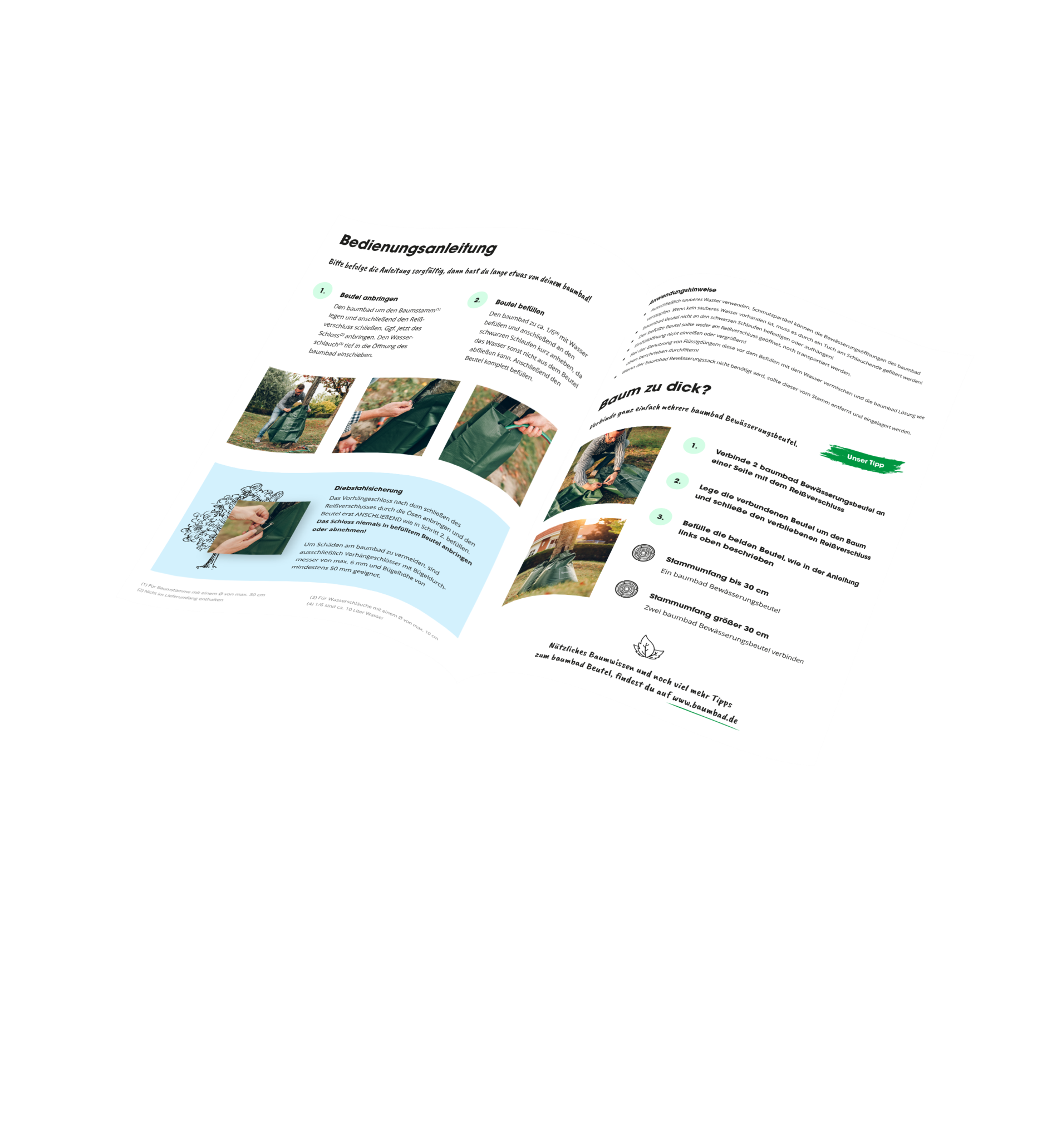 Schmutzpartikel können die Bewässerungsöffnungen des baumbad verstopfen. Wenn kein sauberes Wasser vorhanden ist, muss es durch ein Tuch am Schlauchende gefiltert werden! Jeder Beutel hat zudem ein Schmutzauffangbecken installiert. Um dieses zu leeren, das Restwasser im Beutel regelmäßig durch die Einfüllöffnung entleeren. Dafür den Beutel kopfüber halten.
