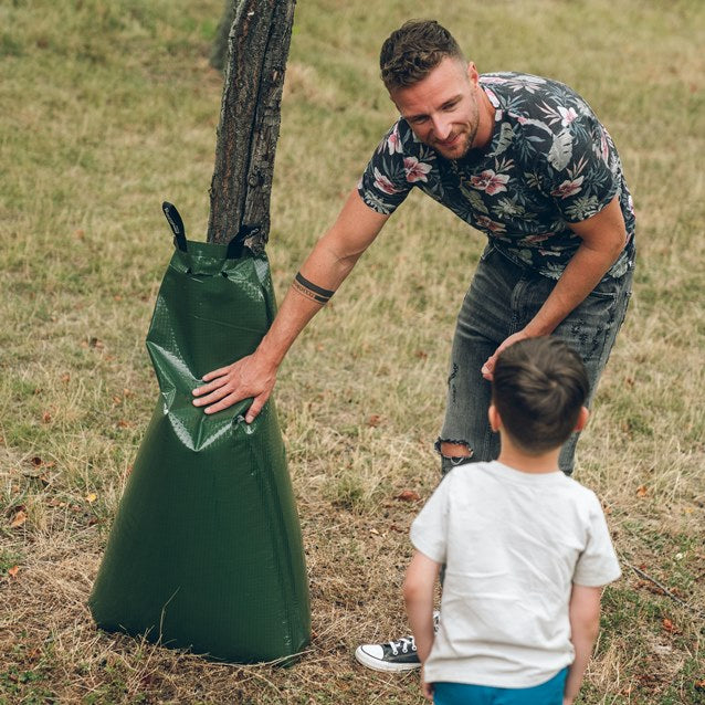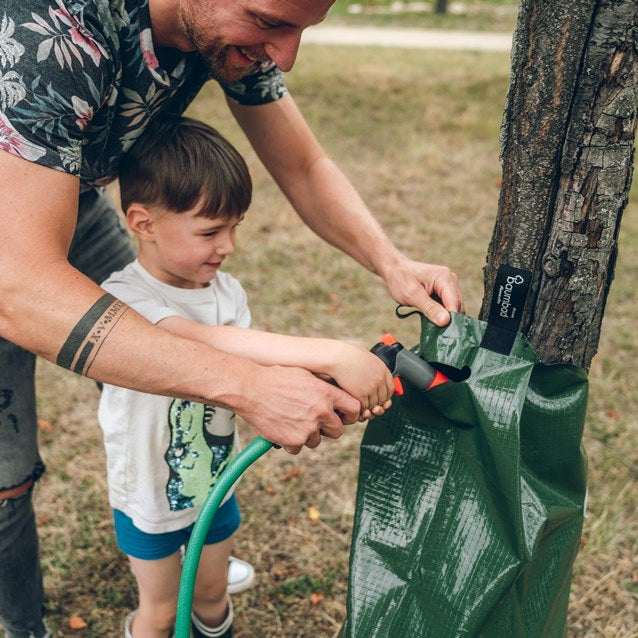 Durch die bis zu 7 Stunden dauernde Tröpfchenbewässerung, können Bäume supereinfach mit nur einer Befüllung bewässert werden. Die lange und gleichmäßige/kontinuierliche Bewässerung ermöglicht den Bäumen, das Wasser wesentlich effektiver und effizienter aufzunehmen, als durch normales Gießen. Das schützt Bäume noch besser vor Hitze und Austrocknung bei Dürre und anhaltenden Trockenperioden.