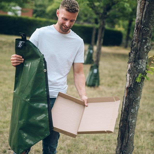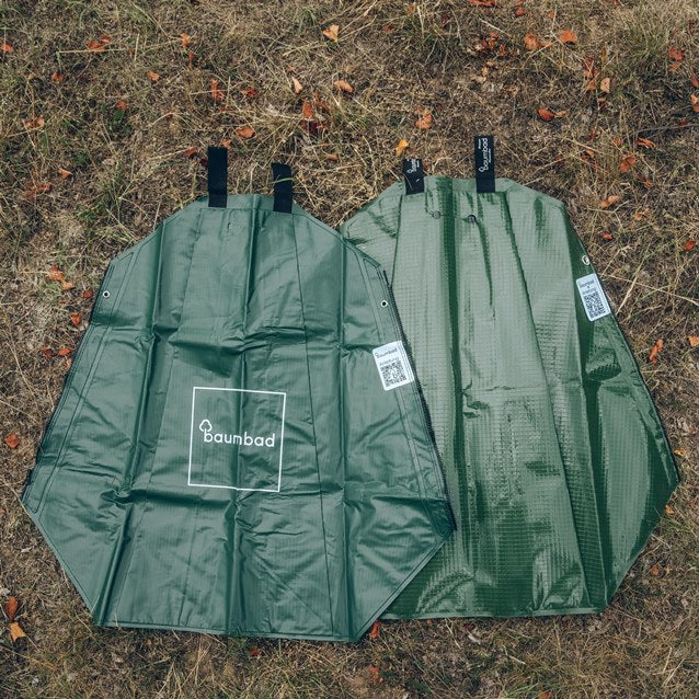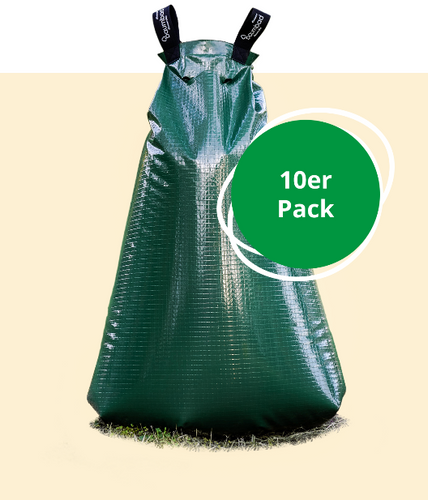 10 Wassersäcke für Bäume zum Vorteilspreis, ersparen dir Geld und Zeit! Die Bewässerungssäcke werden mit bis zu 75 Litern gefüllt und geben nach und nach, bis zu 9 Stunden kleine Tröpfchen in das Erdreich ab. Kleinere Mengen Wasser über einen längeren Zeitraum verteilt, können die Wurzeln viel besser aufnehmen, um den Baum zu versorgen. Dadurch wird kein Wasser verschwendet und du musst nicht ständig gießen. Die robusten und wetterbeständigen Wassersäcke werden einfach mit einem Reißverschluss um den Baumstamm befestigt. Damit sie nicht gestohlen werden können, lassen sich den Wassersack mit einem Vorhängeschloss sichern. Bei einem großen Baumumfang können mehrere Wassersäcke verbunden werden. Wenn du den Wassersack aus Polyethylen (PE) von baumbad für mehrere Bäume verwenden möchtest, oder der Stammumfang größer als 30 cm ist, dann nutze am besten den Preisvorteil von unserem 10er Pack.